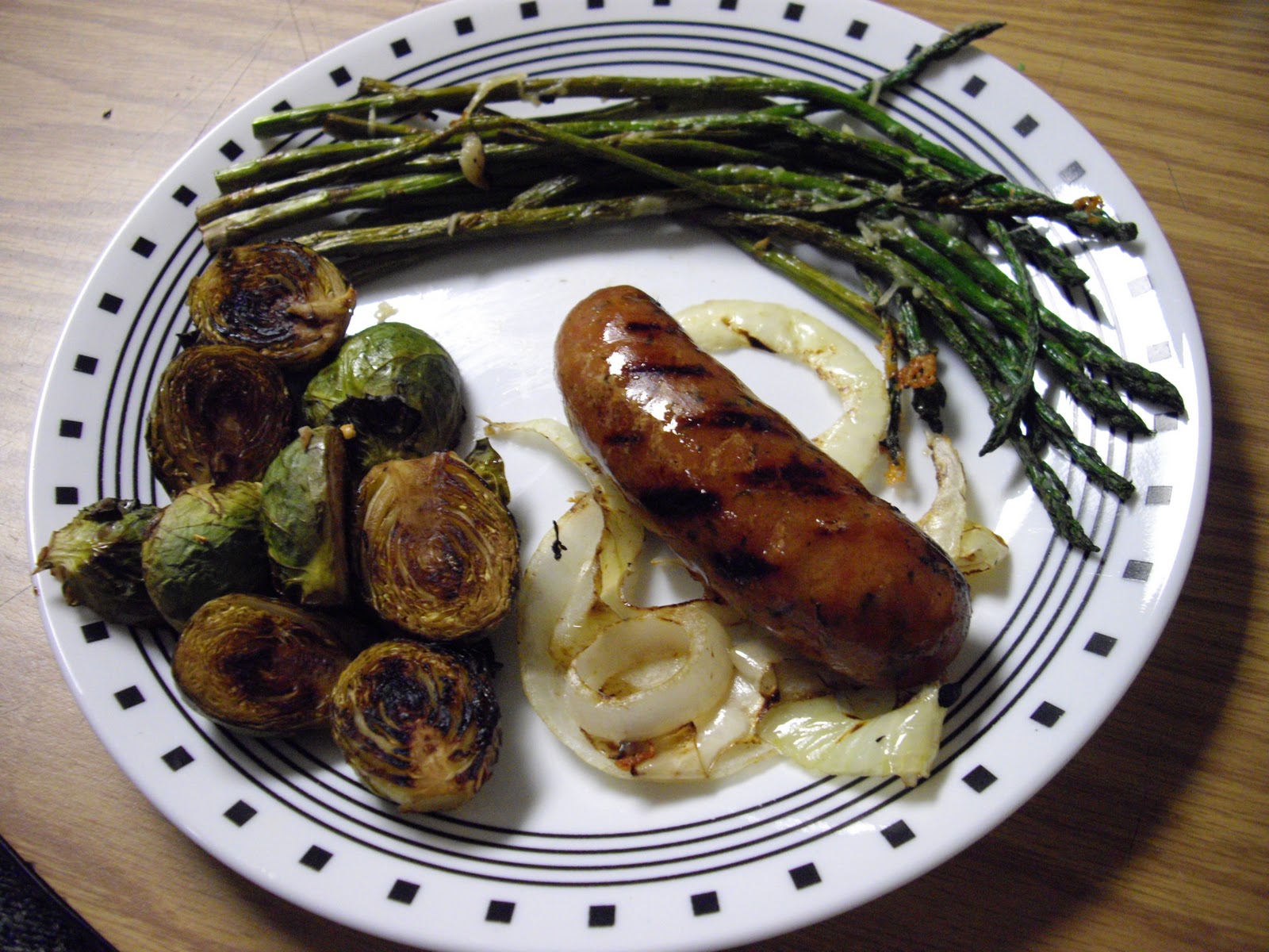 Served up with grilled asparagus and chicken & apple sausage with grilled onion