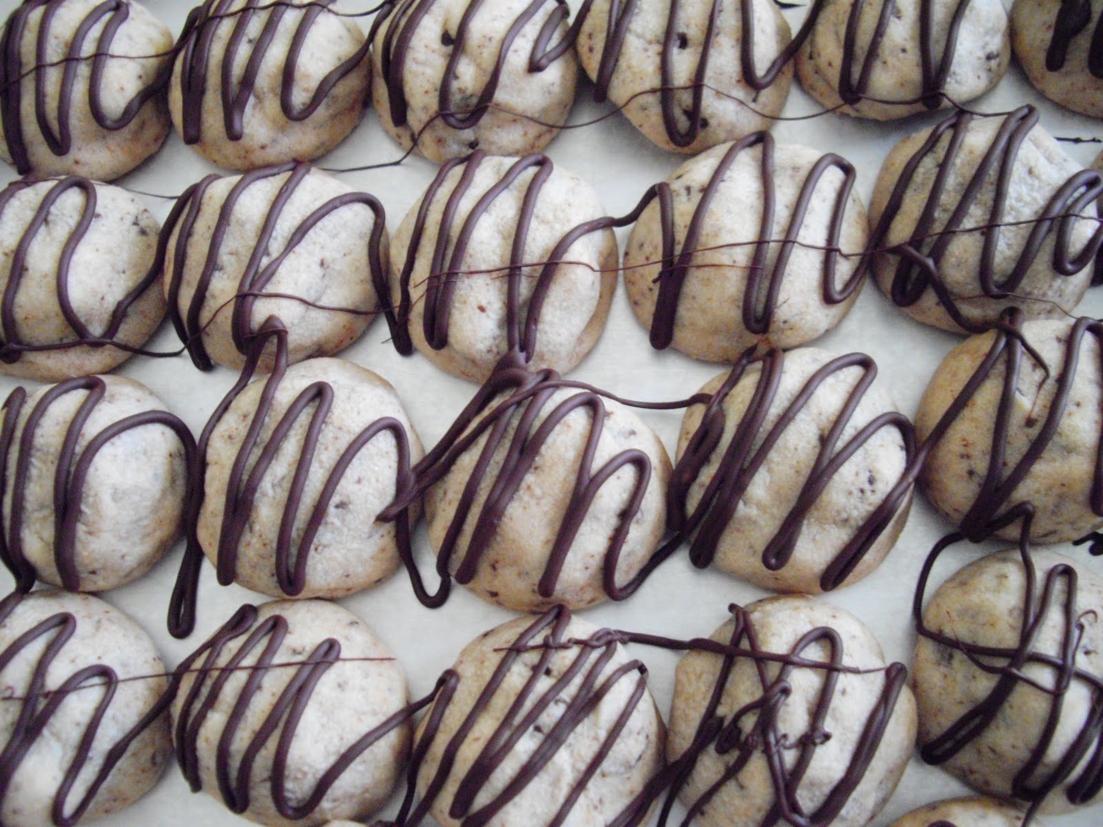 With the remaining 1/2 cup of chocolate chips, melt in the microwave at 30 second intervals, stirring in between. Scrape into a plastic bag and snip off the corner. Drizzle the melted chocolate over the cookies. Allow the chocolate to harden and then serve.
