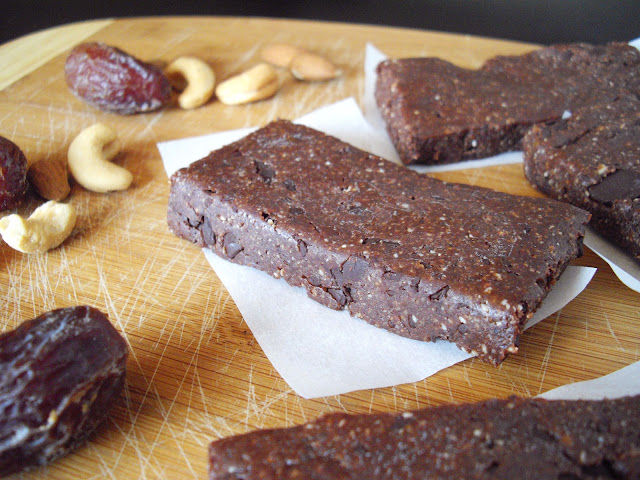 In a food processor, grind the cashews, almonds and walnuts until they are fine crumbs. Add in the dates and pulse until chunky. Add the cocoa, vanilla, agave, salt and coconut. Pulse until well blended and a dough forms. Stir in the chocolate chips or pulse them in for finer pieces. Press into a wax paper lined 11″x7″ pan, and cut into bars. Store in an airtight container in the freezer or refrigerator.