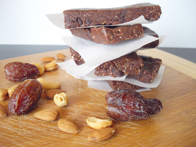 These bars are full of healthy fats from almonds, cashews, coconut and walnuts. The nuts add in protein, and the coconut adds in some fiber. They’re naturally sweetened with dates and a tiny bit of agave nectar. Dark chocolate chips.. you can never go wrong there.