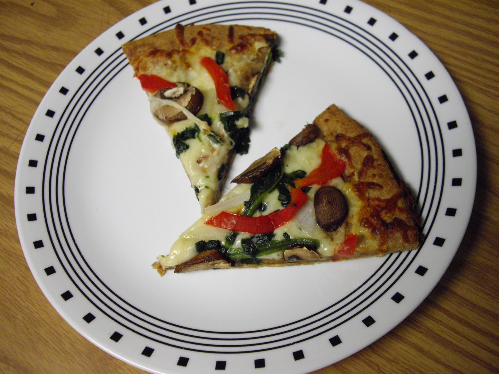 We don’t have a round pizza pan..or a pizza stone..so we flipped a cookie sheet over and put the pizza on top of it to bake!  We used a Boboli Whole Wheat Thin Crust; it was delicious!  I’m going to venture into homemade crust soon (I hope!).