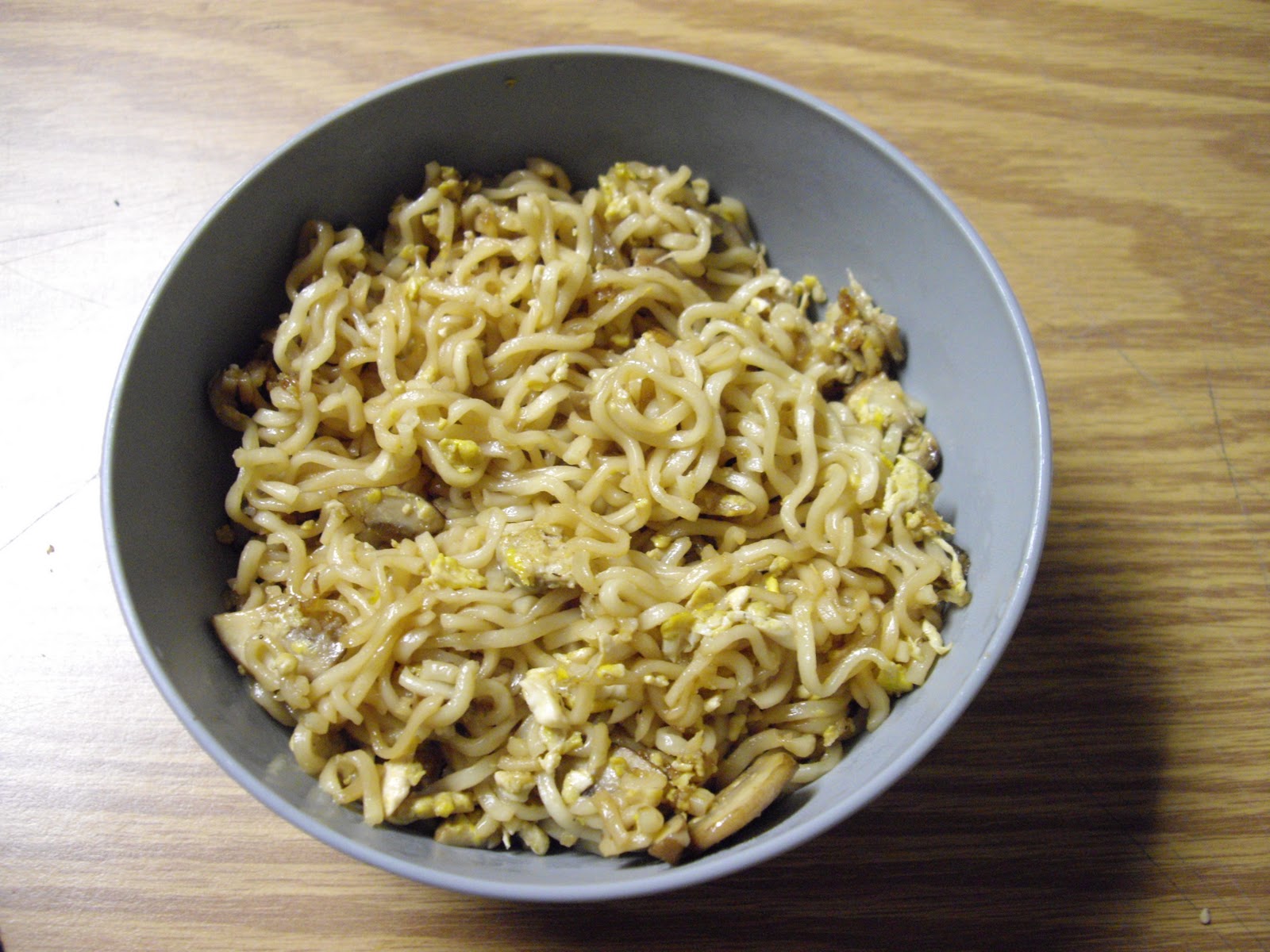 Soak the ramen noodles in warm water to soften slightly.  Fry up the egg with a little bit of soy sauce in oil, scrambling while frying.  Add in the veggies and about 1 T of each oil and soy sauce and cook until softened.  Add in the softened noodles and cook until fully softened and well mixed.  Add the remaining oil and soy sauce, cook until well absorbed.  Season with salt and pepper and serve hot.