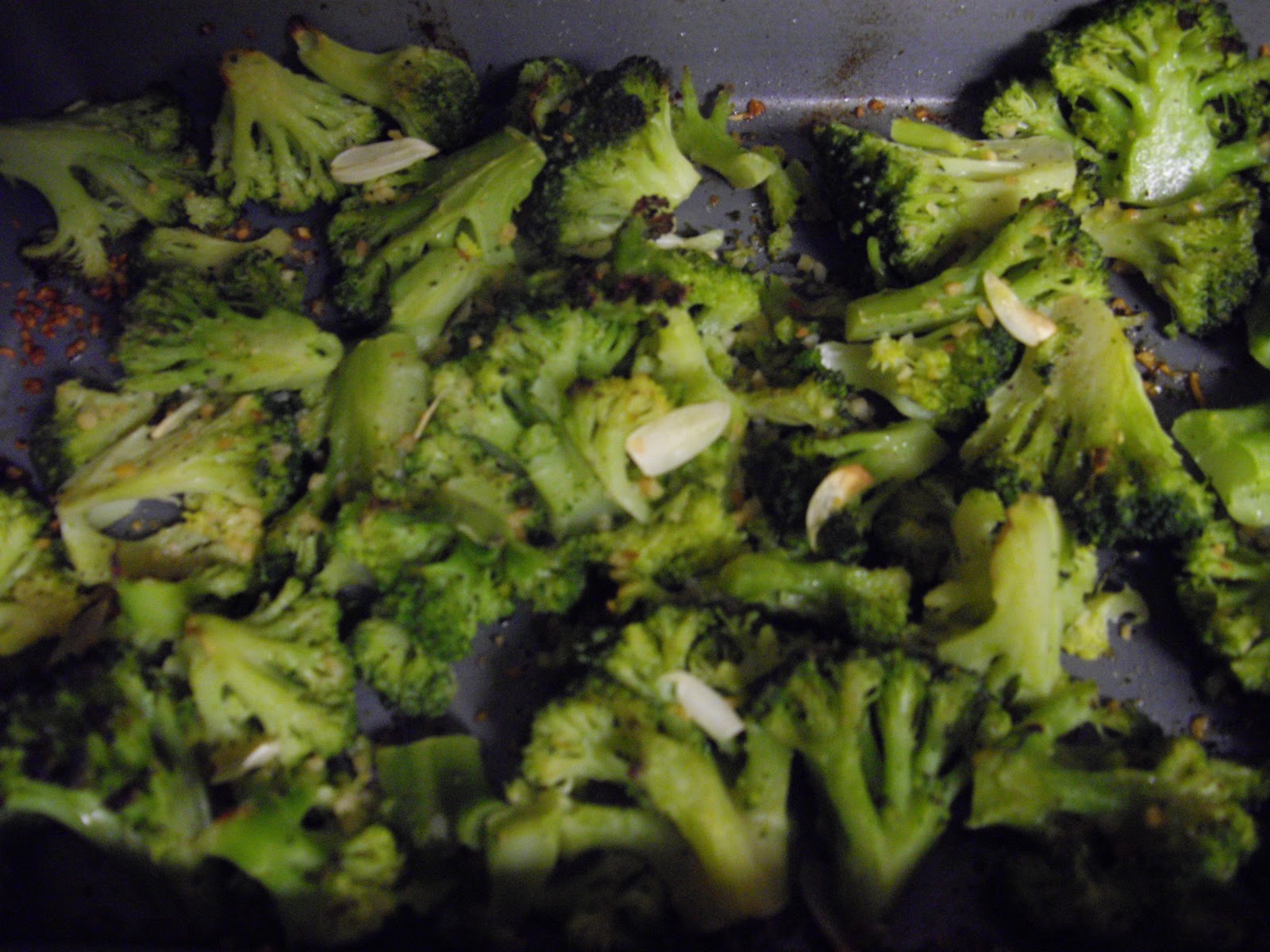 Preheat the oven to 400ºF.  Chop the broccoli into bite sized pieces and toss with olive oil, garlic, salt, pepper and pepper flakes in a mixing bowl.  Place mixture on a cookie sheet and bake for about 20-25 minutes, until broccoli is tender and slightly browned.